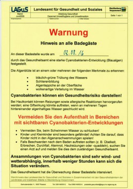 Im Bereich der Badestelle und der angrenzenden Seepromenade des Strasburger Stadtsees wurden am 02.08.2016 durch das Gesundheitsamt nach Entnahme von Gewässerproben Cyanobakterien (Blaualgen) festgestellt. Blaualgen können je nach vorhandenen Windverhältnissen an die Wasseroberfläche der Badestelle getrieben werden. Cyanobakterien können ein Gesundheitsrisiko darstellen. Das Baden sollte daher vorübergehend vermieden werden. Der Hautkontakt oder das Verschlucken von Wasser kann insbesondere bei Kindern zu Erbrechen, Übelkeit und Hautreizungen führen. Vorsicht sollte auch für badende Hunde außerhalb der Badestelle gelten. Entsprechendes Informationsmaterial ist in der Stadtverwaltung Strasburg vorhanden. An der Badestelle sind Warnhinweise aufgestellt worden. Bei neuen Erkenntnissen wird die Stadt Strasburg (Um.) umgehend informieren.