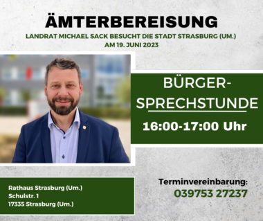 Die Bürgersprechstunde ist in der Zeit von 16:00 bis 17:00 Uhr im Rathaus der Stadt Strasburg (Um.) geplant. Bürgerinnen und Bürger, die den Landrat persönlich sprechen wollen, werden gebeten, vorab über das Sekretariat einen Termin zu vereinbaren. Für diese Gespräche sind ca. 8 bis 15 Minuten geplant. Je nach Dauer können 4 bis 7 Personen ihre Anliegen persönlich an den Landrat richten.