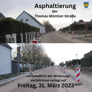 Die Asphaltierung der Thomas-Müntzer-Straße konnte aufgrund der Witterungsverhältnisse am 28. März 2023 nicht erfolgen. Vorbehaltlich der Witterung am 31. März 2023 wird diese nun am Freitag nachgeholt.