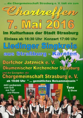 Im Oktober des Jahres 2014 war die Chorgemeinschaft Strasburg zum Herbstfest des Liedinger Singkreises nach Straßburg in Kärnten eingeladen. Die Tage dort waren geprägt von herzlicher Gastfreundschaft der Straßburger. Wir freuen uns sehr auf den Gegenbesuch des Liedinger Singkreises vom 5.-8.Mai 2016. Höhepunkt wird unser Chorfest am 7. Mai 2016 im Kulturhaus der Stadt Strasburg (Um.) sein. Wir freuen uns auf den Besuch vieler Strasburger.