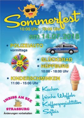 Das Sommerfest auf den Gelände des Kiosk am See bietet eine breite Palette an Angeboten. Von 10.00 bis 18.00 Uhr stehen ein Glücksrad und eine Hüpfburg bereit. Kinderschminken, Kuchen, frische Waffeln und Softeis lassen keine Langeweile aufkommen. Auch ein Polizeiauto kann inspiziert werden.