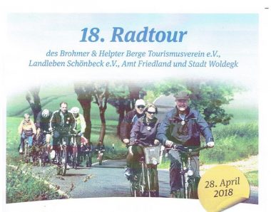 wir laden Sie herzlich zu unserer 18. Radtour der Region Brohmer & Helpter Berge am 28.04.2018 ein. In diesem Jahr erwarten Sie auf 40 km neue und bekannte Sehenswürdigkeiten der Region. Der Startschuss fällt um 10.00 Uhr in Schönbeck, Mühlenstraße 28. Kostenbeteiligung: 2,00 €