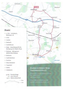 Die Tour führt über Golm – Lindow – Badresch – Groß Miltzow – Helpt. In Helpt ist eine Besichtigung der Kirche und Besteigung des Helpter Bergs geplant, weiter geht es nachWoldegk zum Mühlenberg (Mittagessen und Besichtigung der Mühlen), weiter über Mildenitz – Groß Daberkow – Kreckow – Klein Daberkow – Voigtsdorf – Rattey – Schönbeck. Hier kann bei einem geselligen Zusammensein der Abschluß des Tages genossen werden.