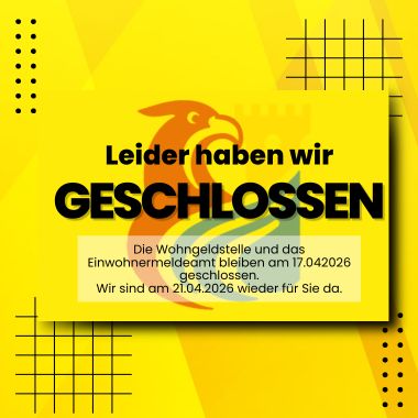 Einwohnermeldeamt am 17.04.2026 geschlossen 2026-04-16 2026-04-16 Anne Collier Am Freitag, den 17.04.2026, bleibt das Einwohnermeldeamt aus personellen Gründen geschlossen. Wir bitten um Verständnis und empfehlen, Anliegen an einem anderen Öffnungstag zu erledigen.