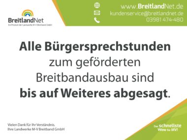 Aufgrund der aktuellen Corona-Entwicklungen und der damit verbundenen behördlicher Regelungen sowie weiteren umzusetzenden Maßnahmen, müssen die geplanten persönlichen Bürgersprechstunden zum geförderten Breitbandausbau der Landwerke M-V Breitband GmbH bis auf Weiteres abgesagt werden. Sie als Bürger*innen haben aber die Möglichkeit, sich das schnellste Wow für M-V mit einem kostenlosen Glasfaser-Hausanschluss zu sichern.