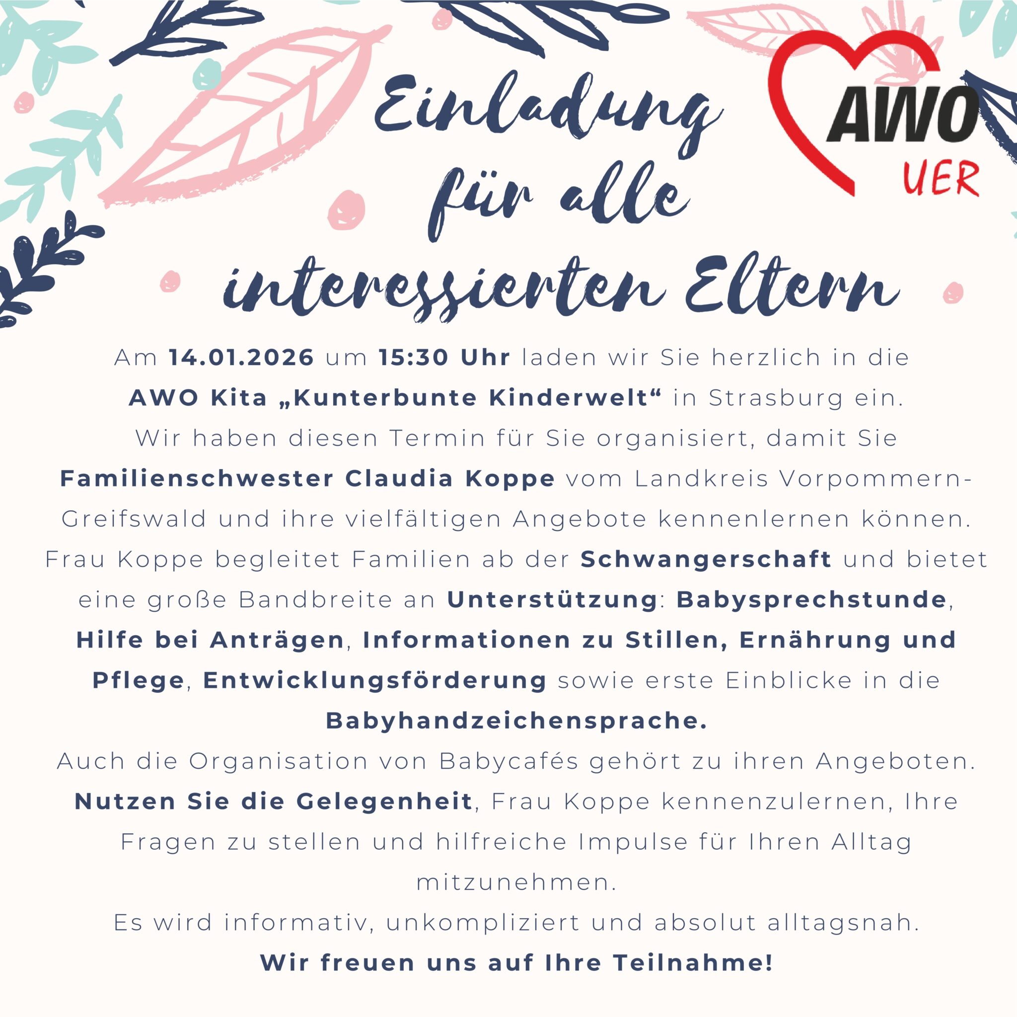 Am 14. Januar 2026 um 15:30 Uhr lädt die AWO-Kita „Kunterbunte Kinderwelt“ in Strasburg Eltern zu einer Informationsveranstaltung ein. Für diesen Termin wurde die Familienschwester Claudia Koppe vom Landkreis Vorpommern-Greifswald eingeladen, um ihre Arbeit und ihre vielfältigen Angebote vorzustellen.