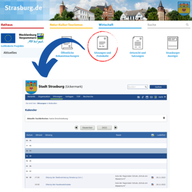Durch den Sitzungskalender erhalten Sie einen Überblick über alle anstehenden Gremiensitzungen. Neben allen öffentlichen Sitzungsinhalten (Vorlagen, Anträge und Anfragen der Fraktionen, Einladungen, Niederschriften), können Details zu den einzelnen Gremien und Mandatsträgern abgerufen werden. Eingebettet auf unserer Homepage www.strasburg.de unter „Sitzungen und Protokolle“, finden Sie hier alle Infos zu den Sitzungen.